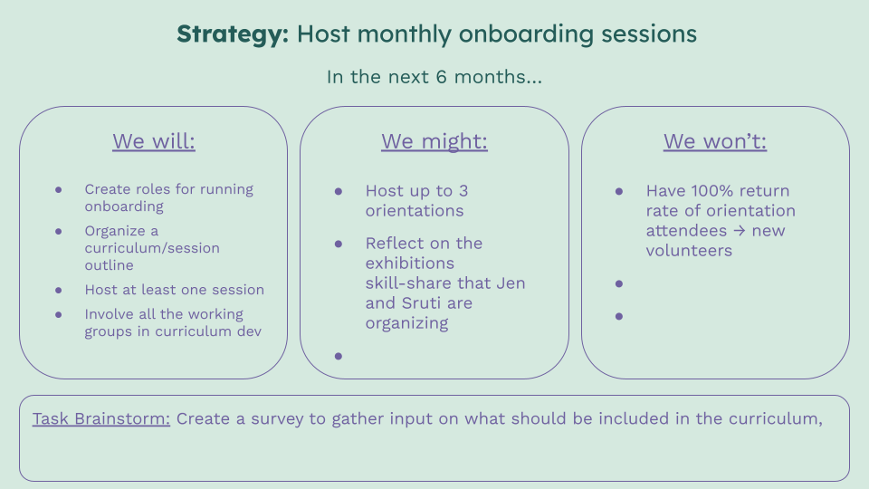 Result: Transparent conversations about gender-bias in volunteer work. Led to the creation of new working groups including the Orientation Working Group, which focused on managing orientation education and processes.